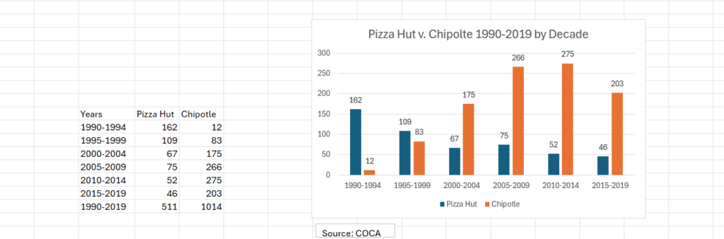 2. Research Question: Consider how the prominence of “Pizza Hut” and “Chipotle” has changed over time and what this might suggest about their impact on American culture. You may alternatively compare other restaurants or stores.