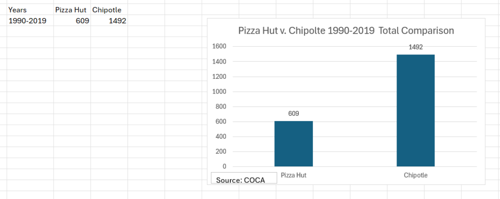 Chipotle was founded in 1993 by Steve Ells. Like the Carney brothers and Pizza Hut, Ells borrowed money from his family—dad, and $85,000. The Chipotle fast food business model was able to expand because of a $360 million capital investment by McDonalds in 1998. According to Yahoo Finance, in 2024, Chipotle has 3,700 stores in the Unites States and each store averages $3.2 million in gross sales. Information from COCA reinforces the fact that in 1990-1994, Chipotle had a frequency of twelve, and the frequency increased to 203 from 2015-2019.